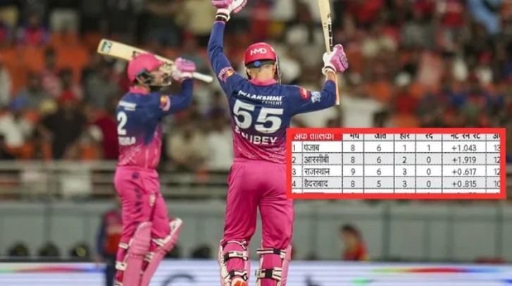 पंजाब किंग्स को हराने के बाद राजस्थान रॉयल्स की टीम अंक तालिका में तीसरे पायदान पर पहुंच गई है।जीत के साथ एक स्थान के फायदे के साथ आरआर की टीम 12 अंक के साथ तीसरे पायदान पर पहुंच गई है, जबकि हैदराबाद की टीम को घाटा हुआ है। हैदराबाद की टीम 10 अंक के साथ .चौथे स्थान पर है। पहले स्थान पर पंजाब किंग्स की टीम 13 अंक और +1.043 नेट रन रेट के साथ मौजूद है। दूसरे नंबर पर आरसीबी की टीम 1.919 नेट रन रेट के साथ बरकरार है।